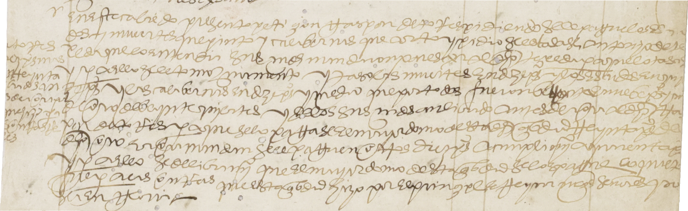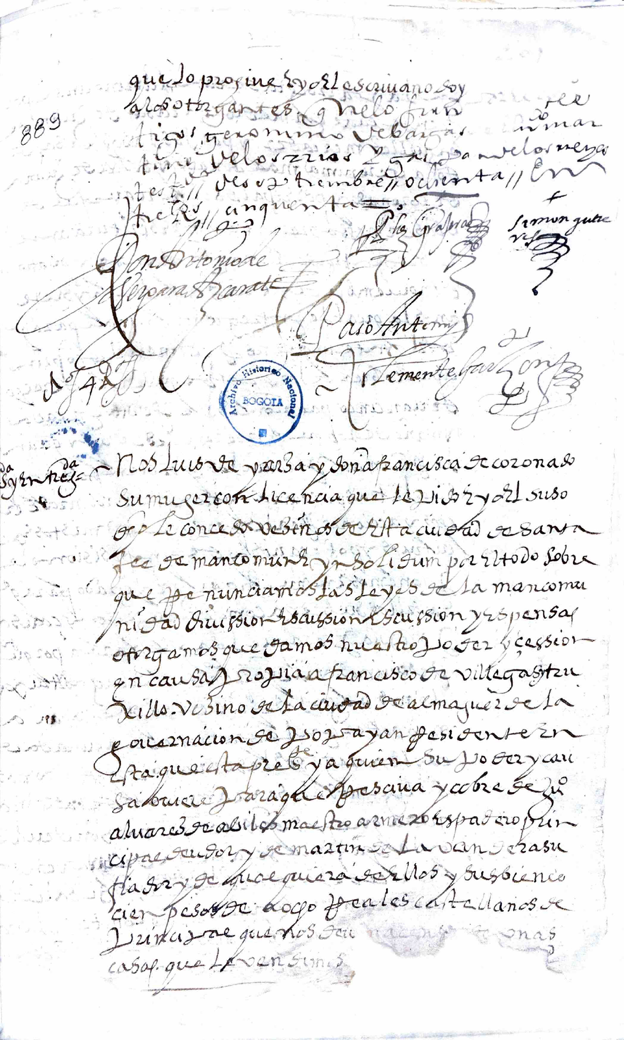 (195r) Censo. Sepan los que esta escritura de censo y tributo al quitar vieren como nos Gaspar de Figueroa pintor y doña Lorença de Bargas su mujer y con su licencia principales obligados y Marcos Suárez escultor que me constituyo su fiador y hago de caso ajeno mío vecinos de esta ciudad de Santafé todos tres de mancomun e ynsolidum por el todo sobre que renunciamos las leyes de la mancomunidad división excusión y expensas otorgamos por nos y nuestros herederos que vendemos por vía de censo y tributo al quitar en favor de la priora y monjas del convento de Señora Santa Clara de esta dicha ciudad y su patrón y mayordomo y de quien legítimamente lo haya de haber diez y siete pesos y medio de a ocho reales cada uno de censo en cada un año los cuales vendemos al dicho convento por precio de trescientos y cincuenta pesos de la dicha moneda que nos los principales recibimos de mano de Diego Arias Torero patrón del dicho convento y en su nombre en reales acuñados de cuyo entrego yo el escribano doy fe que se hizo en mi presencia y de los testigos de esta (195v) escritura que el precio susodicho es así con de a veinte mil el millar conforme a la nueva pragmática de Su Majestad y nos obligamos de pagar al dicho convento y a quien su causa hubiere los dichos diez y siete pesos y medio de la dicha moneda de censo en cada un año cada seis meses la mitad comenzando como comienza a correr desde hoy día de la fecha de esta escritura y sucesivamente los demás años que adelante corrieren y la dicha cantidad imponemos y cargamos que la haya y tenga el dicho convento sobre nuestras personas y bienes que al presente tenemos y adelante tuviéremos y especial y señaladamente sobre dos pedazos de solar que nos los principales tenemos en esta ciudad en la parroquia de Santa Bárbara (…) (197v) por cuanto otorgo esta escritura de mi agradable voluntad que es fecha en la ciudad de Santafé a diez y nueve de agosto de mil y seiscientos y treinta años y los otorgantes que yo el escribano conozco lo firmaron presentes la dicha Doña Lorenza de Vargas con su poder y por ella lo firmó un testigo que fueron Juan Rodríguez de Abrego Francisco Sánchez y Andrés Vellón.