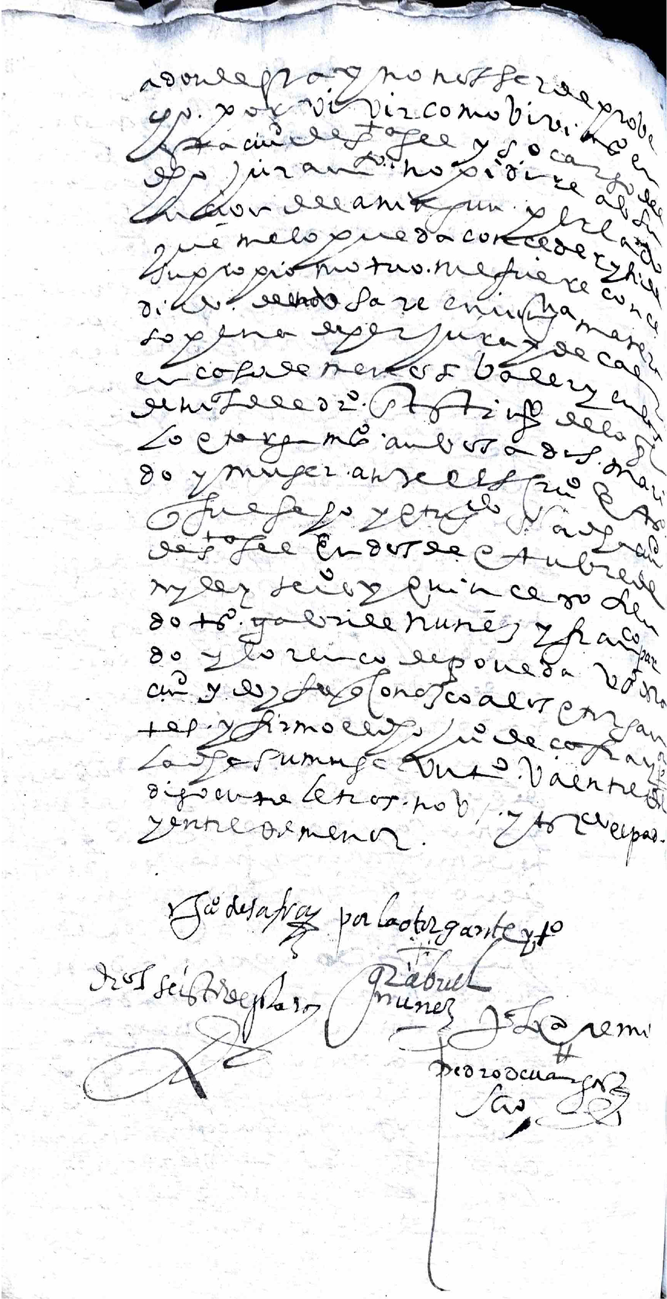 (904v) Juan de Acero presentó por testigo a un hombre que dixo llamarse Phelipe Baptista de quien yo el presente escribano de cámara le recibí juramento y lo hizo por Dios nuestro Señor y la Señal de la Cruz prometió decir verdad y preguntando al tenor de la querella que va por causa dixo= Que lo que sabe es que ha comunicado con amistad a Francisco Suáres de seis meses a esta parte el cual comunicó cómo se quería casar con doña Catalina de Acero doncella que estaba en casa de su hermano Juan de Acero, diciendo era hombre bien nacido y de buena gente en el Pirú de donde decía era natural y que para este fin vio que el susodicho la escribía papeles y le mostró respuestas dellos de la susodicha por los cuales se concertaron de casar y viendo este testigo lo referido y que sería sin gusto del dicho Juan de Acero le avisó de lo que pasaba con la dicha su hermana el sábado pasado hoy hace ocho días, como oficial que trabaja con él al oficio de pintor, y aunque supuso diligencia en guardarla porque la moza decía se quería casar aburrida del maltrato que le daba su cuñada Doña Felipa de Cañola, mujer del dicho Juan de Hacer, y estando este testigo entendiendo mediante el aviso que dio no sucedería, el martes en la noche como a las ocho de la noche fue el dicho Juan de Acero a casa de este testigo y le dijo como el dicho Francisco había sacado de su casa a la dicha su hermana y este testigo le advirtió que solo podría haberla llevado a casa de Doña Agueda Cabueñas por ser la casa en que tenía conociencia [sic] el susodicho y el día siguiente por la mañana (905r) se supo como era cierto estar en la dicha casa y a diligencia fueron el dicho Juan de Acero la depositaron en casa de una prima suya en el barrio de las Nieves y ha entendido el testigo ser por orden del provisor y vicario general y que el dicho Francisco Suares le ha dicho a este testigo cómo para el efecto de casarse la sacó la dicha noche sin que tuviese otro fin a lo que le dijo y que esto que ha dicho y declarado es la verdad so cargo de su juramento en que se afirmó y ratificó siéndole leído. Es de edad de veinte y dos años y no le tocan otras generales que ser oficial del dicho Juan de Acero como lleva referido y lo firmo=