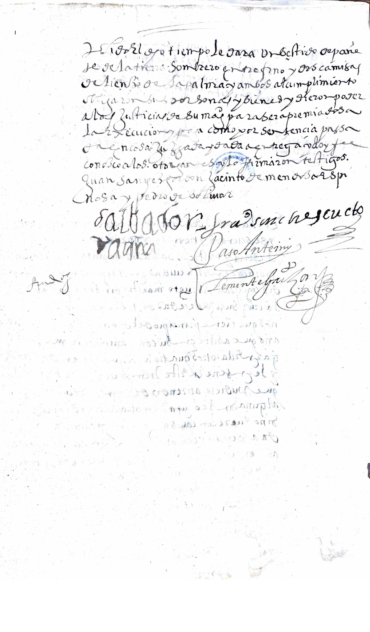 (54r) En la ciudad de Santafé a siete de abril de mil y seiscientos y treinta y nueve años ante mí el escribano y testigos Salvador Baquira indio ladino morador en esta ciudad entregó y puso por aprendiz con Francisco Sánchez Cueto maestro pintor a Pascual de la Cruz su hijo de edad de trece años poco más o menos que tiene principio del dicho arte porque ha un año que asiste en su compañía para que le tenga en ella otros cuatro años que corren desde hoy y le enseñe en este tiempo del dicho arte todo lo que pudiere aprender del sin le encubrir cosa alguna y sin le ocupar en otra cosa ni despedirlo si no fuere con causa legítima y habiéndola pueda asentar con otro maestro y no hará falta ni ausencia y si la hiciere el dicho su padre lo traerá a su costa a que cumpla las fallas = y el dicho Francisco Sánchez Cueto lo aceptó y recibió el dicho muchacho por los dichos cuatro años en los cuales lo ocupará en la dicha enseñanza como [roto] (54v) cumplido el dicho tiempo le dará un vestido de paño de la tierra sombrero entrefino y dos camisas de lienzo de La Palma y ambos al cumplimiento obligaron sus personas y bienes y dieron poder a las justicias de su Majestad para ver apremiados a la ejecución y paga como por sentencia pasada en cosa juzgada y dada a entrega y doy fe conozco a los otorgantes y lo firmaron testigos Juan Sánchez Jacinto de Mendoza Espinosa y Pedro de Bolívar.