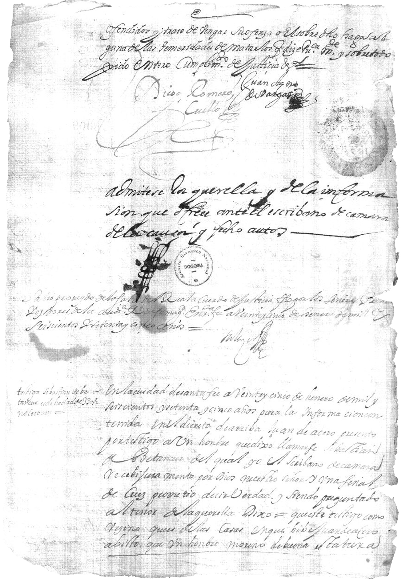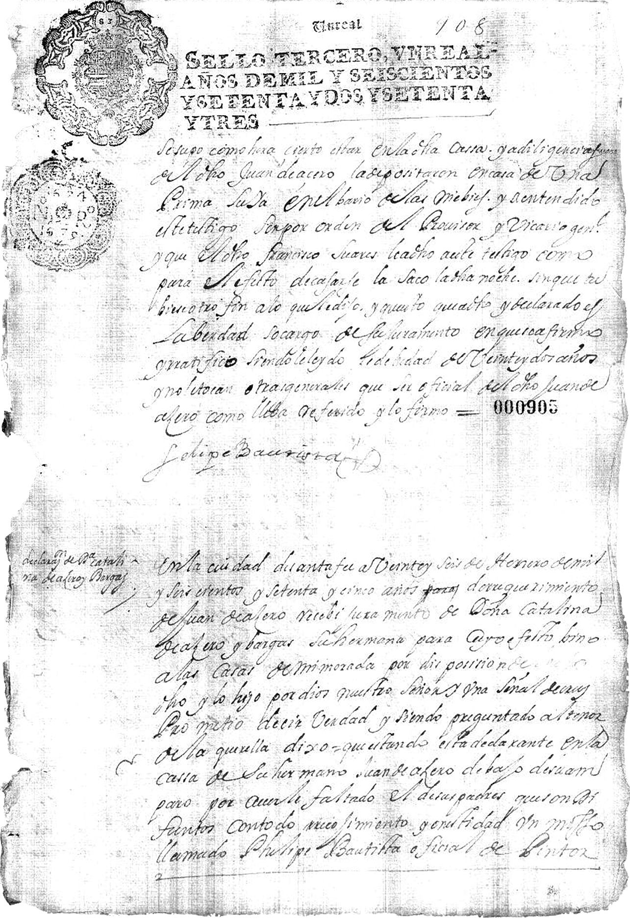 En la ciudad de Santafé a veinte y seis de enero de mil y seiscientos y setenta y cinco años para da requerimiento de Juan de Acero recibí juramento de doña Catalina de Azero y Bargas su hermana para cuyo efecto vino a las casas de mi morada por disposición del susodicho y lo hizo por Dios nuestro Señor y una Señal de la Cruz prometió decir verdad y siendo preguntado al tenor de la querella dixo= que estando esta declarante en la casa de su hermano Juan de Azero de bajo de su amparo por haberle faltado el de sus padres que son difuntos con todo reconocimiento y honestidad un mozo llamado Phelipe Bautista oficial de pintor (905v) que aprende el dicho oficio con el dicho su hermano habló a esta declarante diciéndole que un hombre llamado Don Francisco Suares natural de la ciudad de Quito donde tenía sus padres que eran caballeros y gente muy principal le escribía en papel que le dio y recibió esta confesante después de muy persuadida a ello por decirle era con fin de casarse el susodicho con esta declarante que por hallarse pobre y con muchas necesidades por salir de ellas le pareció bien, siendo la persona que le refería le respondió que sí se casaría en otro papel y en esta conformidad tuvo otros papeles y le respondió a ellos todos en orden al dicho casamiento y instando al susodicho que se saliere para el efecto de su casa, diciendo la sacaría de cualquier empeño y resultando esta declarante que sus hermanos y hermanas le impedirían casarse no lo comunicó con ellos y antes convino en que saldría para el dicho efecto a muchas instancias que le hacía por papeles y recados con el dicho mozo y un sobrinito desta declarante, niño de hasta trece años, con que se resolvió el martes en la noche el día veinte y dos deste presente mes y año, halló esta declarante ocasión de salir porque antes no la había tenido por el cuidado que había con la puerta y para esta dicha noche la tenía prevenida el susodicho y poco antes de las siete de la dicha noche salió esta declarante a la puerta de la calle con intención de enviar avisar al susodicho y a este tiempo iba pasando el dicho Francisco Suares y asió a esta declarante (906r) de la mano y instándole a que se fuese con él, la llevó a casa de doña Leocadia de Cabueñas y la susodicha le preguntó a esta declarante que quién era y habiéndoselo dicho se irritó con el dicho hombre diciéndole cómo había cometido tan grave delito en escalera la casa de ésta confesante y sacarla de ella (…)