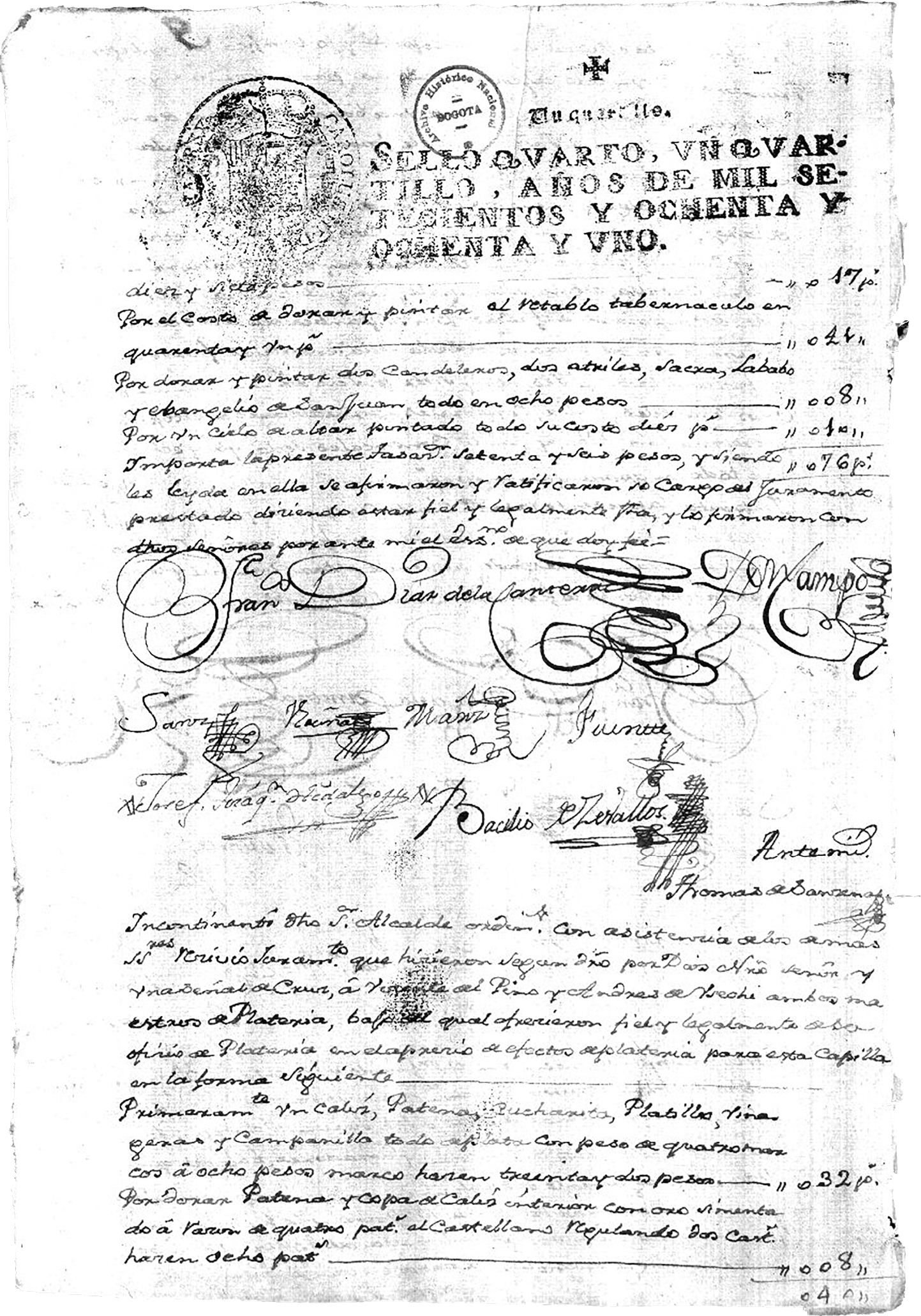 (73r) Yo el escribano hice saber el nombramiento de los avaluadores por lo tocante a pincel y dorados a don Ignacio Posadas y a Ignacio Álvarez del Barco maestros de pincel y dorados quienes aceptaron y juraron por Dios nuestro Señor y una señal de cruz de cumplir fielmente con el ministerio de avaluadores y lo firmaron por ante mi dicho escribano de que doy fe Ignacio Posadas, Ignacio Álvarez ante mí Joaquín Sánchez. (…) En la ciudad de Santafé en diez y siete de agosto de mil setecientos y ochenta y cinco años yo el escribano pasé en compañía del Maestro Pintor Don Ignacio Posadas al Convento e Iglesia del Señor santo Domingo arruinadas del temblor que acometió el día doce de julio a efecto de hacer avalúo por lo perteneciente a su Arte de Pintor revalidando el juramento que tiene el dicho avalúo las pinturas que se maltrataron en dicha iglesia en la forma siguiente=