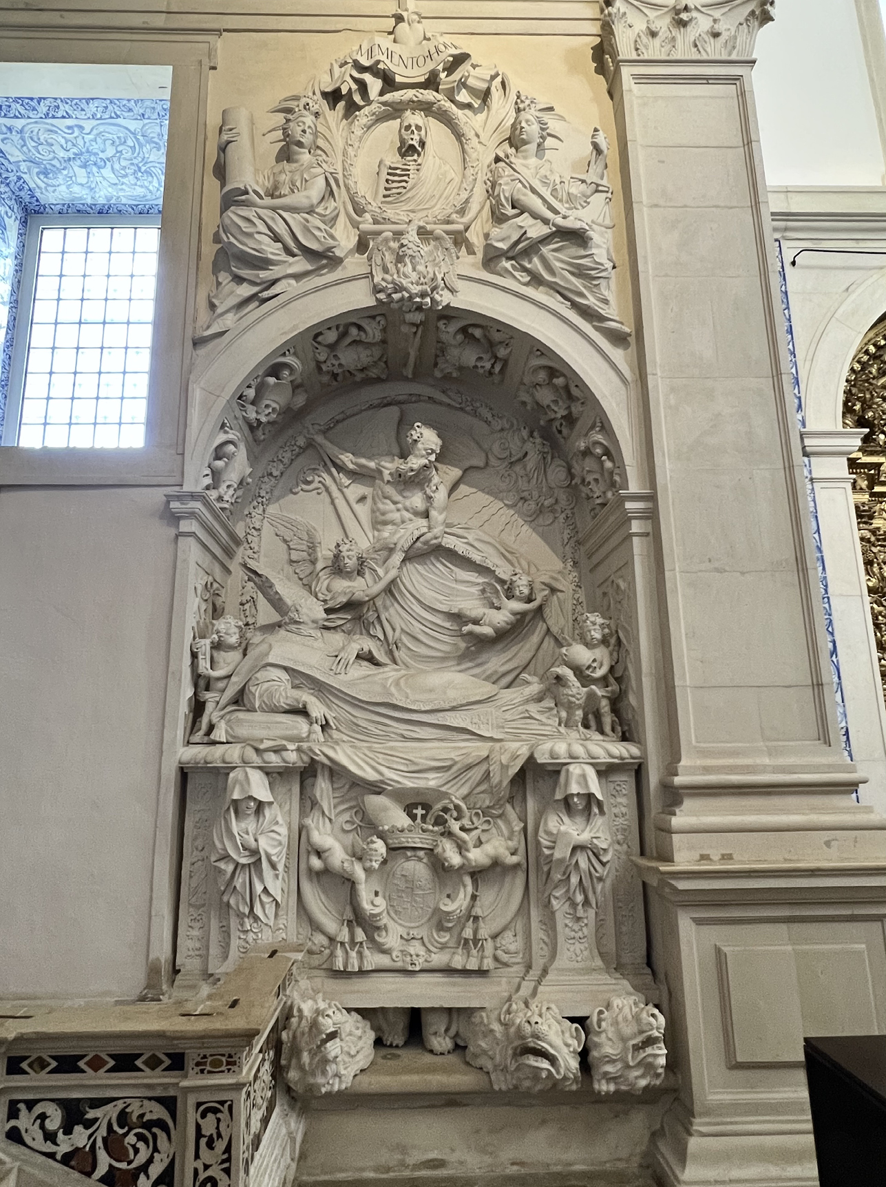 Como es conocido, el encargo de un monumento funerario es en sí mismo una actitud perfectamente enmarcada en la piedad postridentina, que consideraba toda la vida terrena como una preparación para esa vida mejor a la que aspiraba el católico después de la muerte, pero también un intento de perdurar en el recuerdo de los hombres. El obispo se preocupó de garantizar esto último de dos formas diferentes: mediante la obtención del mercado y la feria franca en 1693 [10], que debían celebrarse en el terreiro de la Quinta, delante de la capilla –cuya propiedad dejó al templo en su testamento–, donde se reunían los labradores y artesanos de la comarca los días 13 de cada mes y, por otro lado, a partir de la perpetuación de su memoria y la de su linaje no solo con los monumentos funerarios, sino con las abundantes representaciones heráldicas y el rico programa iconográfico que transmite el componente escultórico.