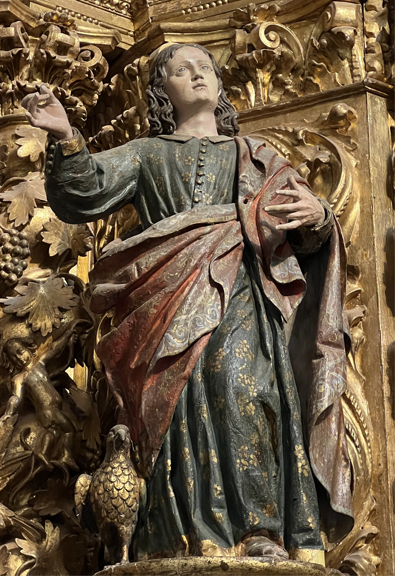 Junto a ella es posible identificar otros componentes de su universo devocional. La Virgen del Rosario tenía una especial significación por su vinculación con la orden dominicana, pues como él mismo expresó en 1691 en una relación enviada al papa Inocencio XII, era “decendente por linha paterna de Dom Pedro Rodrigues de Gusmão, conquistador da vila de Moura em Portugal, neto de Dom Félix de Gusmão, que foi irmão do Patriarca São Domingos” [14]; pero también con la elección personal de los citados Manoel Furtado Botelho y su “cunhada”, a quienes como se ha dicho les concedió licencia para poderse enterrar en una capilla de la Virgen del Rosario, origen del actual colateral de dicha invocación (Fig. 4). Por último, una última devoción personal se representó en la capilla. Nos referimos a san Juan Evangelista, del que el obispo confesó en sus últimas voluntades haber sido devoto desde sus primeros años de vida (Fig. 5).