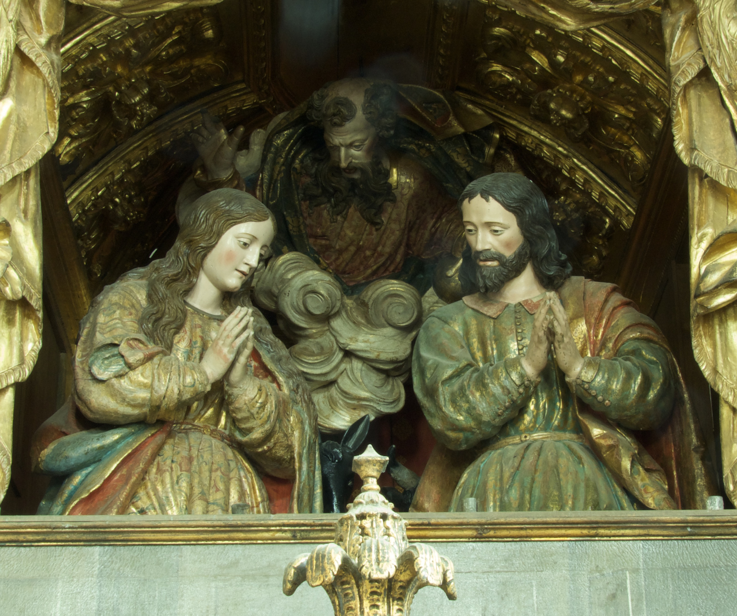 Pero, ¿por qué un encargo de esta categoría a un escultor español? Aunque desde Miranda de Duero siempre se miró hacia Zamora, Salamanca y Valladolid –el propio D. Manuel ordenó acudir en 1694 a la primera de esas ciudades para llamar a un famoso organista para la catedral– [40], el citado prestigio recuperado de la escultura vallisoletana en el último tercio del XVII no parece suficiente para explicarlo; sobre todo desde que la expansión económica experimentada por Portugal en las décadas de 1680 y 1690 motivó la existencia de suficientes tallistas en Lisboa perfectamente capacitados para responder a las exigencias de nuestro prelado [41]. Además, la experiencia de obra de arte total que supone la capilla de Vista Alegre, por medio del bel composto de la arquitectura, la pintura, la talla de la madera, el dorado, el embutido e incluso la epigrafía, declaran un comitente conocedor de las novedades formales que desde la capital del reino se irradiaban al resto del territorio [42]. Tampoco parece suficiente la existencia del vallisoletano retablo mayor de la catedral de Miranda de Duero, asentado en 1614, cuya escultura realizó Gregorio Fernández [43]. Aunque la obra introdujo notables novedades compositivas (orden gigante y ático muy desarrollado) y plásticas (monumentalidad, contundencia volumétrica y naturalismo de sus esculturas) no se convirtió, quizás por la pobreza de la región, en un referente para la talla local [44]. De la misma manera, tampoco parece probable que el citado Gabriel del Barco, el pintor español –seguntino de nacimiento y joven pintor en Madrid– especializado en la pintura decorativa de techos y azulejos, que triunfó en Portugal y que trabajó para nuestro comitente, fuera conocedor del foco escultórico vallisoletano.