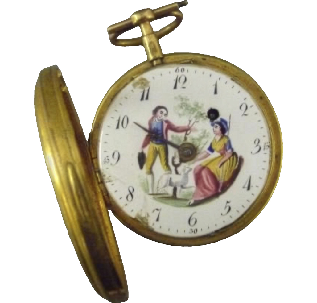 Francia era uno de los centros más importantes de producción horológica. Atravesando la frontera sabemos que llegaron relojes franceses que estaban decorados en su caja con esmaltes que contenían imágenes bucólicas o representaciones profanas [28]. Algunos de los realizados en el último cuarto del siglo fueron obra del relojero Abraham Louis Breguet (1747-1823). Estos relojes solían estar adornados en su esfera principal lo que lo hacían más lujosos. Este es el caso de un reloj de bolsillo conservado en el Museo de Bellas Artes de París. Este reloj tiene una caja sencilla y pulida y fue realizado entre 1775 y 1789. La esfera esmaltada contiene una representación de una mujer con un vestido antiguo a la izquierda y un gran jarrón gallonado con drapeado a la derecha [29].
