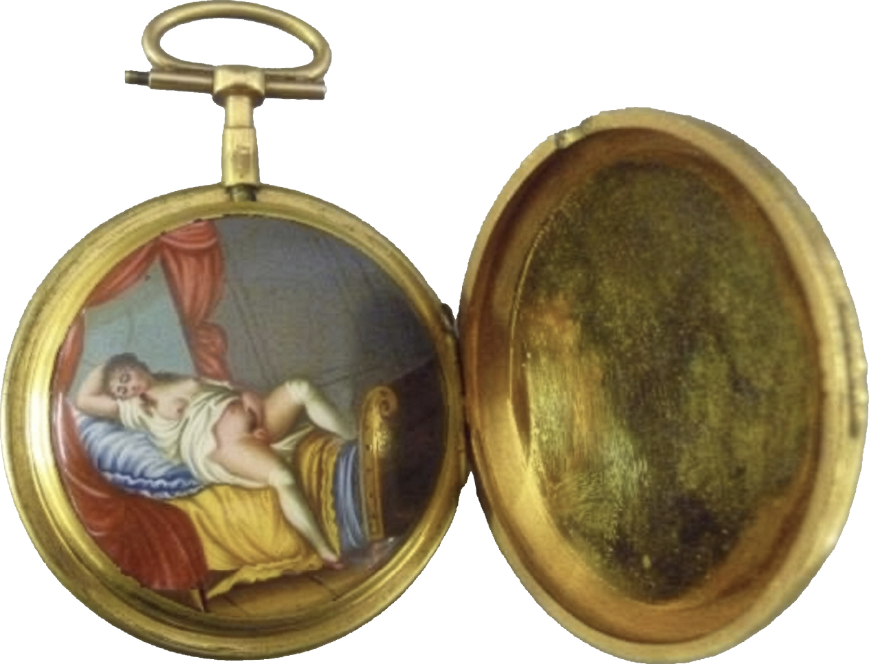 La extensión del uso personal de los relojes como un signo no solamente útil, sino también de exhibición social entre distintos estamentos de la sociedad de la segunda mitad del siglo XVIII permitió que también se ocultasen en ellos escenas libertinas que daban otro valor al objeto. Los relojes de bolsillo permitían ocultar en su interior escenas eróticas, unas veces eran sencillas representaciones metálicas y en otras podían incluir mediante un resorte un movimiento para acentuar la sorpresa del cliente. Eran objetos, por tanto, que consumía generalmente un público masculino. Al incorporarse las pinturas con esmalte en las esferas de los relojes, se adornaron con escenas bucólicas, mitológicas o incluso patrióticas con la llegada de la Revolución francesa. Junto a estas hubo relojeros que escondieron en el reverso del reloj pinturas esmaltadas de desnudos femeninos y de escenas consideradas por la moral impúdicas. La maquinaria de estos objetos mecánicos permitía asimismo ocultar en su esfera pinturas y representaciones lascivas que a medida que avanzaba el siglo popularizaron los cambios de hábito sociales con la moda de unas publicaciones libertinas y de unos comportamientos que se liberaban del corsé de las normas del Antiguo Régimen. Los procesos de la Inquisición en el siglo XVIII demuestran el celo que la institución puso para impedir la introducción de libros prohibidos y de imágenes deshonestas que pudiesen alterar el orden social en un momento de cambios y crisis provocadas por la Ilustración y la Revolución francesa que afectó a la política, la cultura y la filosofía europea y que condicionó la sociedad del viejo continente, así como impidió que las nuevas ideas intentasen cruzar al americano [10]. Por ello persiguió a los propietarios que tuvieran pinturas, esculturas deshonestas o dibujos con imágenes procaces, así como desnudos indecentes a la mirada del censor inquisitorial. Para evitarlos muchas de estas imágenes consideradas provocativas, obscenas o impúdicas se escondían en compartimentos secretos en relojes o tabaqueras y que mediante artilugios y resortes quedaban a la vista. Otros acompañaban la lectura de libros considerados inmorales, mientras que también hubo un mercado secreto de grabados, vidrios para linternas mágicas y barajas de cartas que reproducían amores carnales.