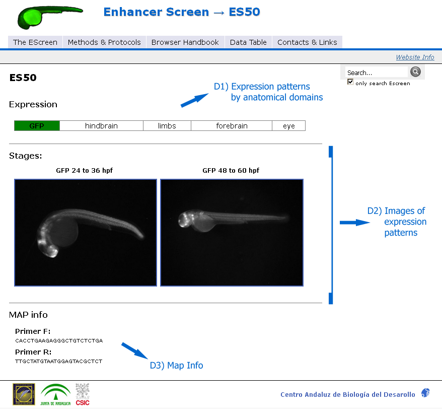ES pages contain additional information for each ES line distributed into three main sections: Expression patterns by anatomical domains, Images of expression patterns and Map info. They can be visited via:
