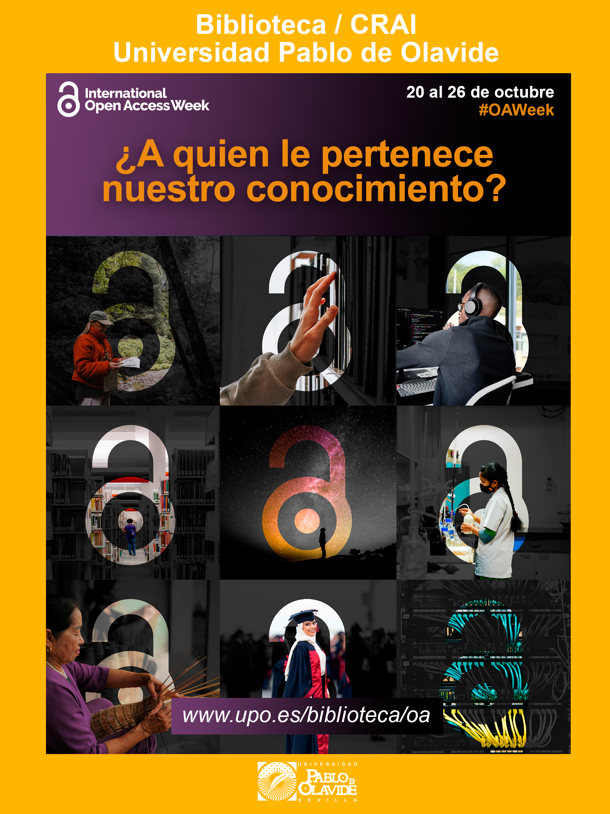 Con este espíritu, la Biblioteca/CRAI de la Universidad Pablo de Olavide se suma un año más a esta conmemoración con el propósito de acercar los principios del acceso abierto a toda la comunidad universitaria mediante actividades lúdicas y divulgativas que combinan aprendizaje, participación y concienciación.