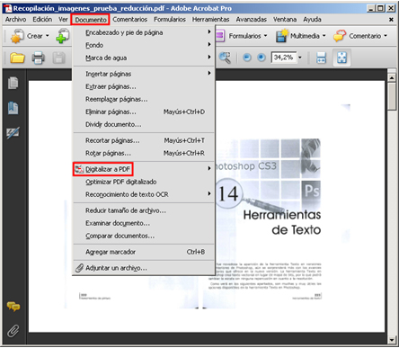Esta opción se encuentra en el menú "Documento", y en las opciones que nos aparecen elegimos "Optimizar PDF digitalizado":