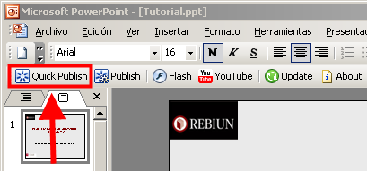 Ésta es la opción más rápida de todas, ya que con tan solo dos clics del ratón te convierte tu .ppt a Flash. Sigue los pasos:
