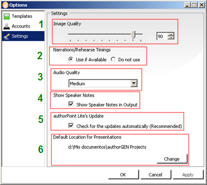 - Default Location for Presentation (ubicación predeterminada para la publicación): Con el botón "Browse" puedes elgir la ubicación que desees para guardar la publicación flash de tu PowerPoint.