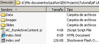 Esta es la carpeta donde se almacena todo lo necesario para que tu presentación en flash pueda ser visualizada correctamente, y con la página Index.html, necesaria para "lanzar" el flash en cualquier navegador.