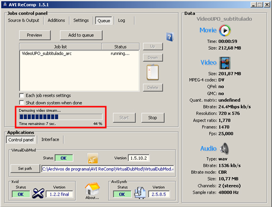 Realizando el incrustado final de los subtítulos en el Vídeo Avi