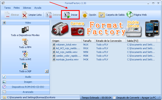 Los videos están listos para ser convertidos al Formato FLV. Tan solo debes hacer clic en el botón de Iniciar para comenzar la conversión.