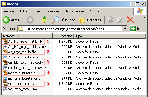 Los nuevos vídeos tiene la extensión .flv (enmarcados de color rojo y numerados) frente a los vídeos con el antiguo formato wmv.