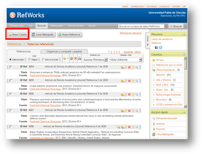 En RefWorks las referencias se organizan en carpetas y subcarpetas (esta es una de las novedades de la versión 2.0)
