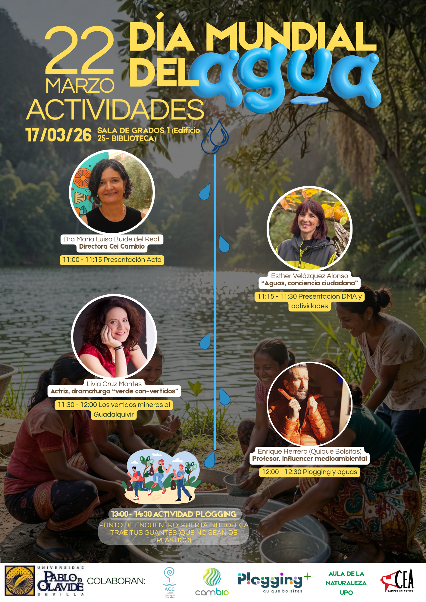 Con motivo del Día Mundial del Agua, el CEi CamBio organiza junto a Aguas Conciencias Ciudadana una jornada especial de concienciación y acción directa en la Universidad Pablo de Olavide el próximo martes 17 de marzo. Este evento reúne a especialistas y activistas para abordar los retos urgentes que enfrentan nuestros recursos hídricos.