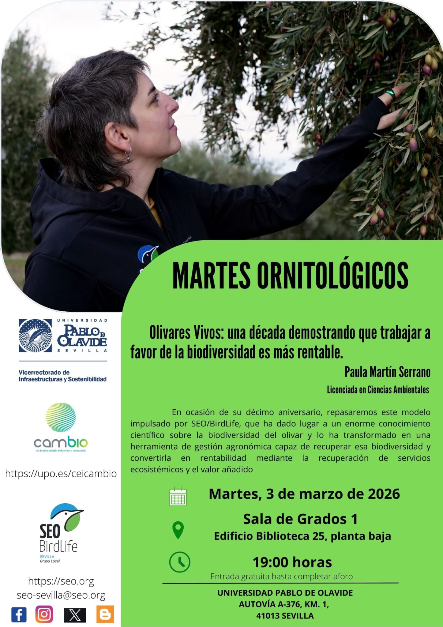 Nueva sesión de los Martes Ornitológicos en la UPO. Paula Martín Serrano (SEO/BirdLife) nos explicará el modelo de Olivares Vivos, una herramienta de gestión capaz de recuperar la biodiversidad del olivar y convertirla en rentabilidad económica tras una década de resultados demostrables.