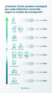 Además, según el medio de transporte que utilices, obtendrás más o menos puntos por kilómetro recorrido. Como muestra la imagen adjunta, caminar es la opción que más ciclos genera, seguido de correr, montar en bicicleta o utilizar transporte público.