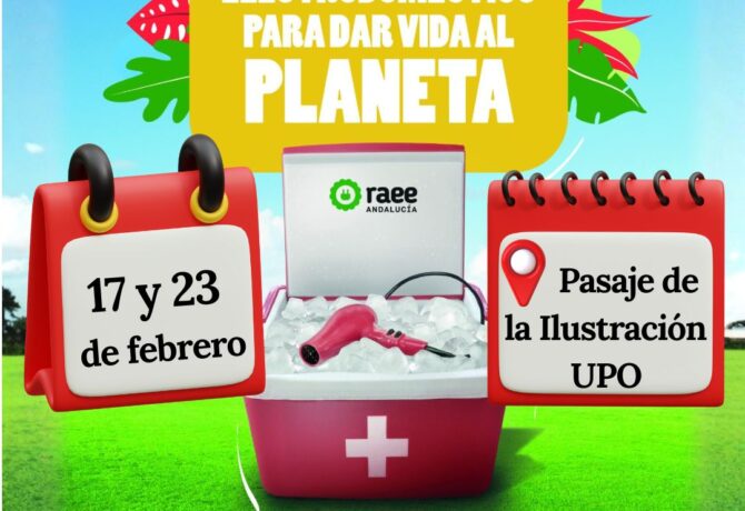 El lunes 23 de febrero, la campaña «Dona vida al planeta» vuelve al Pasaje de la Ilustración de la Universidad Pablo de Olavide. El objetivo de esta iniciativa es concienciar a la comunidad universitaria sobre la importancia del reciclaje de los residuos de aparatos eléctricos y electrónicos (RAEE) y los beneficios de la economía circular. ¿Qué encontraréis? Información detallada sobre la gestión de residuos eléctricos, obsequios para quienes se acerquen al stand y la posibilidad de participar en el sorteo de una tablet o una experiencia de ecoturismo. Ubicación: Pasaje de la Ilustración. Horario: De 10:00 a 14:00 h.