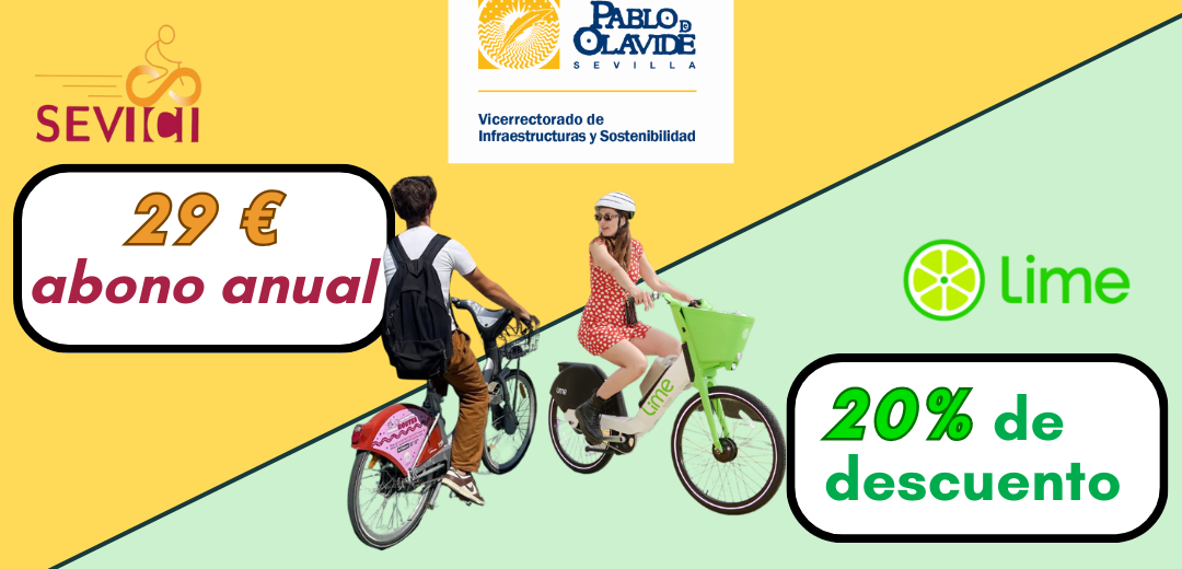 La Universidad Pablo de Olavide sigue apostando por una movilidad más sostenible y saludable para su comunidad universitaria. En este marco, se han establecido convenios con dos de las principales opciones de transporte en Sevilla: Lime y Sevici.