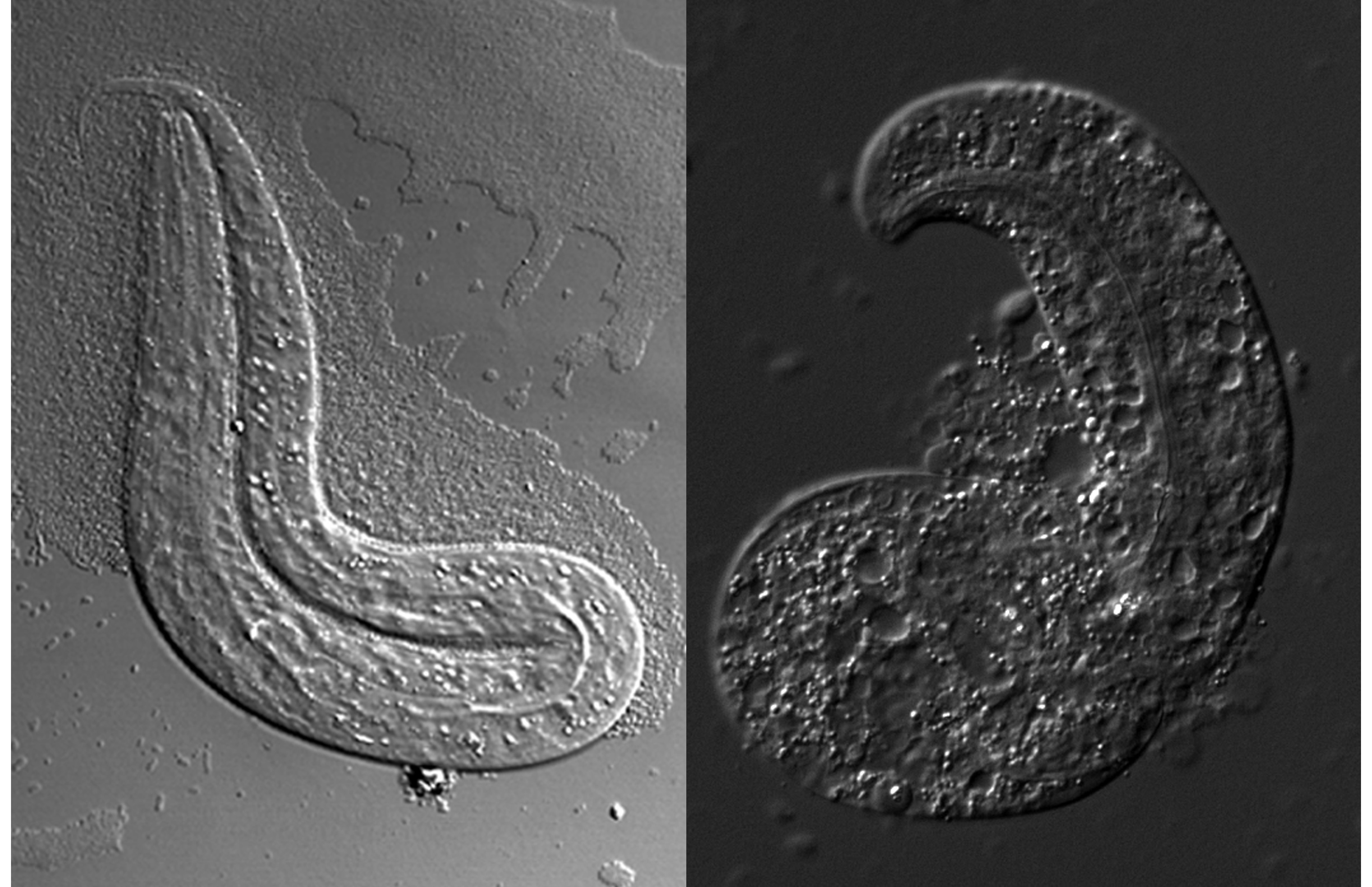 Izquierda, nematodo juvenil normal, derecha, nematodo juvenil modelo de galactosemia tipo III.