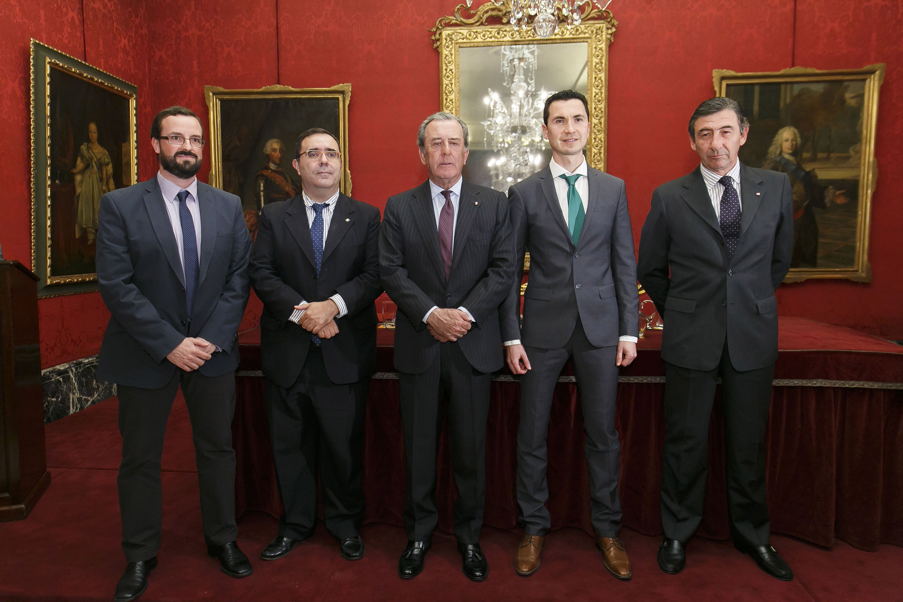 Los premiados junto al rector Vicente Guzmán y el Teniente de Hermano Mayor de la Real Maestranza de Caballería de Sevilla, Javier Benjumea Llorente.