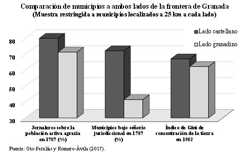 Para llegar a esta conclusión, los autores comparan los municipios del lado castellano de la frontera con los del lado granadino. Por una parte, el lado castellano se organizó y repobló como región fronteriza, circunstancia que marcó el carácter de la Andalucía castellana desde la segunda mitad del siglo XIII hasta finales del XV. La inseguridad militar y las necesidades defensivas hicieron que la nobleza y las órdenes militares se convirtieran en actores claves para asegurar el territorio, acaparando grandes extensiones de tierra y derechos jurisdiccionales. Así, la nobleza encontró en la frontera un medio para ascender en la escala social, económica y política, mientras que –al mismo tiempo– los reyes conseguían asegurar posiciones fronterizas que eran difíciles de defender y estaban en riesgo constante. Otros factores como la baja densidad de población característica de este tipo de regiones fronterizas inseguras y la expulsión de los mudéjares también contribuyeron al alto grado de concentración de la tierra y el poder político en el lado castellano.