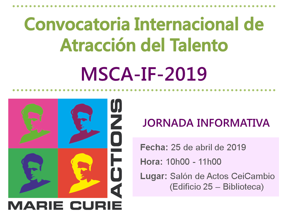 Con motivo de la apertura de la convocatoria MSCA-IF-2019, la Oficina de Proyectos Europeos-OTRI de la UPO, celebrará mañana jueves 25 de abril una jornada informativa en la sala de grados 2 de la Biblioteca, de 10:00 a 11:00 horas. Esta sesión se centrará fundamentalmente en la presentación de las posibles alternativas de participación de los investigadores postdoctorales y las distintas modalidades de la convocatoria. La jornada está dirigida tanto a investigadores que deseen presentar una propuesta como a grupos de investigación interesados en acoger a un investigador postdoctoral.