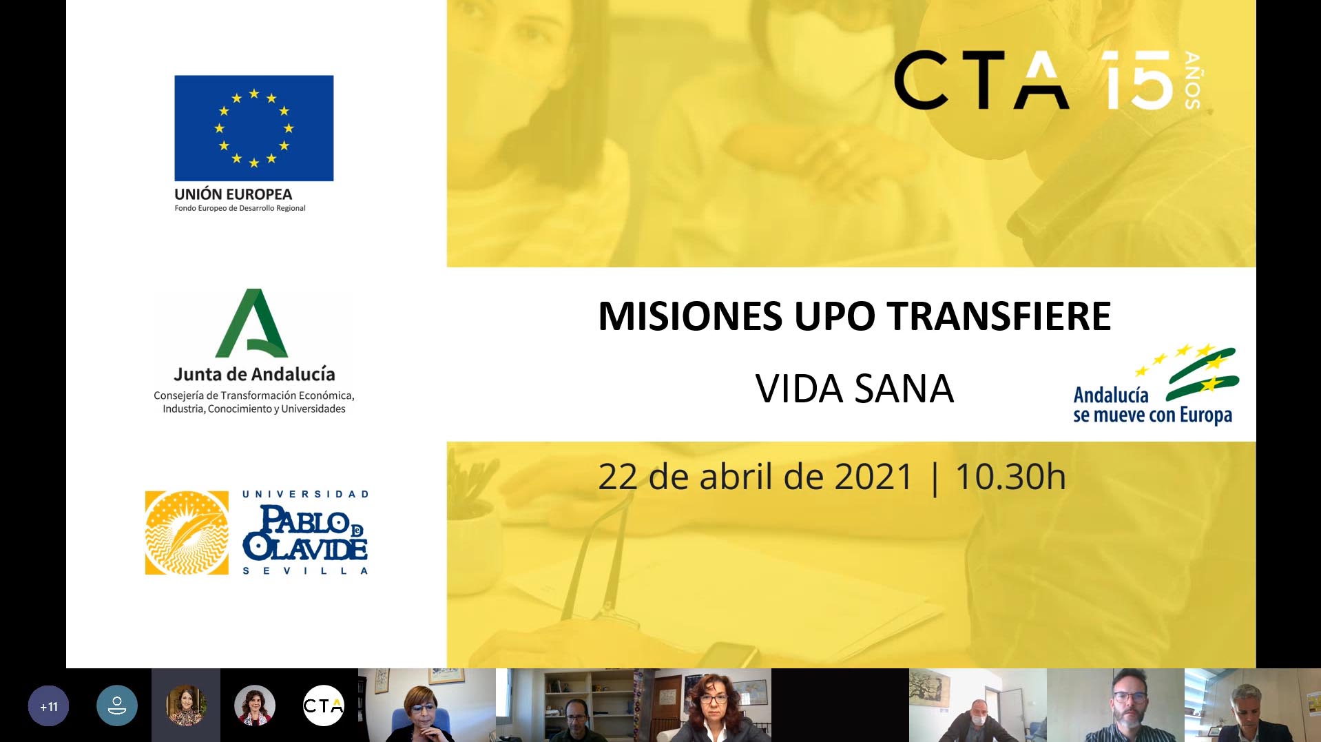 La Universidad Pablo de Olavide (UPO) y CTA (Corporación Tecnológica de Andalucía) han celebrado hoy una jornada online en la que han reunido representantes de 6 empresas biotecnológicas andaluzas y 7 grupos de investigación de esta universidad para impulsar oportunidades de colaboración entre ellos que ayuden a mejorar la transferencia de resultados en el ámbito de ‘Vida Sana’.