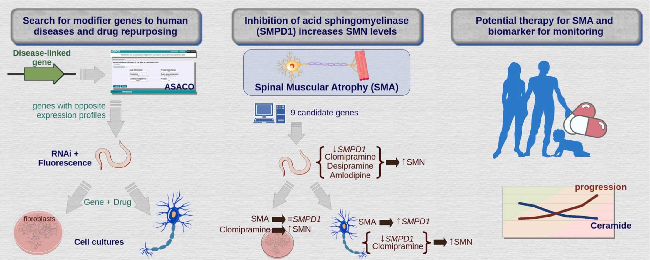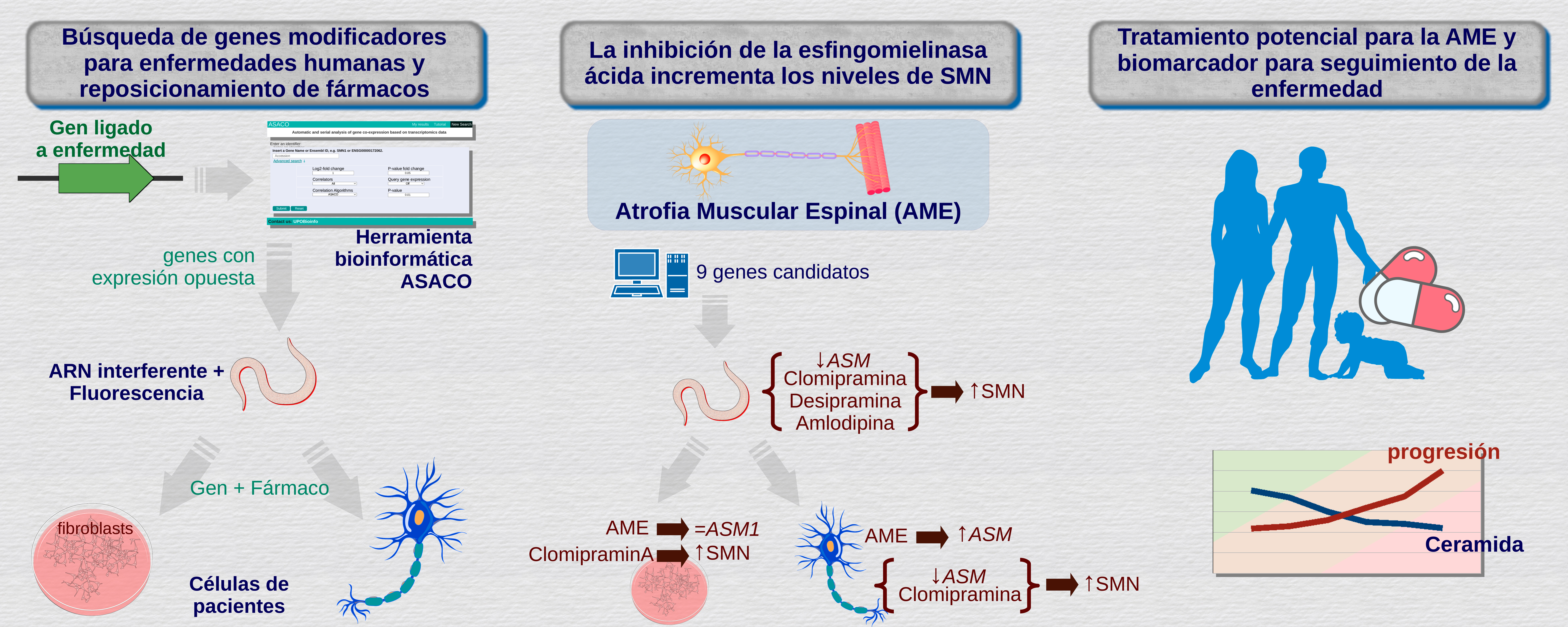 El equipo combinó algoritmos de análisis de datos con modelos experimentales animales. Primero, mediante minería de grandes bases de datos públicas de expresión génica, detectó que la inhibición de la esfingomielinasa ácida estaba asociada a un incremento de SMN. Después lo comprobó en un organismo vivo sencillo, el nematodo Caenorhabditis elegans, en el que observaron que apagar el gen homólogo a esta enzima hacía subir los niveles de SMN. Finalmente, trasladaron la pregunta a un escenario más cercano al paciente: motoneuronas humanas obtenidas a partir de células de pacientes con AME. En estas neuronas, el bloqueo de la enzima elevó la cantidad de SMN y redujo signos tempranos de daño neuronal. Además, se pudo comprobar que las células de los pacientes ya tienen de base niveles elevados de ASM, y que el tratamiento con los mismos fármacos hacía reducir estos niveles.