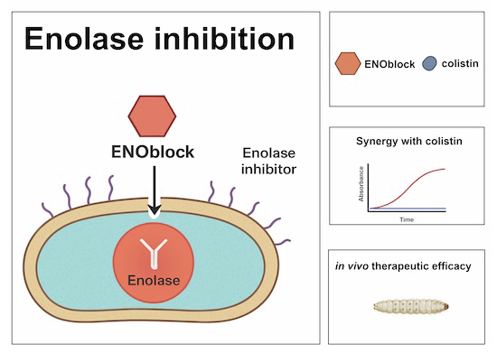 ENOblock ha sido identificado como un inhibidor de la enolasa con potente actividad antibacteriana contra Acinetobacter baumannii, que actúa sinérgicamente con la colistina frente a cepas multirresistentes