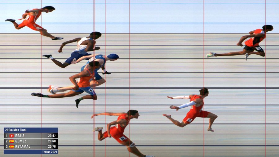 ‘Foto finish’ de la prueba de 200 metros lisos con Jesús Gómez en segundo lugar
