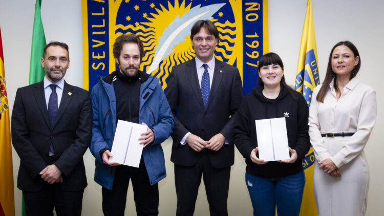 El rector de la UPO Francisco Oliva, acompañado por la vicerrectora de Estudiantes, Marián Morón Martín, y por el delegado del rector para la Calidad, Jordi Luengo López, ha entregado el premio a la estudiante de grado Jessica Arellano y a Pablo de la Cruz Pérez, que ha recogido el premio en nombre del alumno de postgrado Andrés Felipe Monsalve.