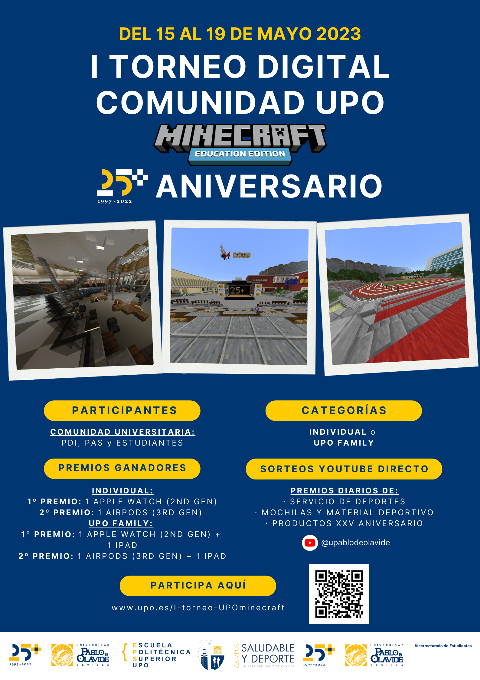 El Vicerrectorado de Estudiantes de la Universidad Pablo de Olavide, en colaboración con la Escuela Politécnica Superior, ha organizado el I Torneo Digital Comunidad UPO ‘Minecraft Education’ XXV Aniversario que se desarrollará entre el 15 y 19 de mayo y tiene como objetivo fomentar el conocimiento de la Universidad en sus 25 años de historia, reforzar el espíritu de comunidad y fomentar el uso de las nuevas tecnologías del metaverso al servicio de la formación.