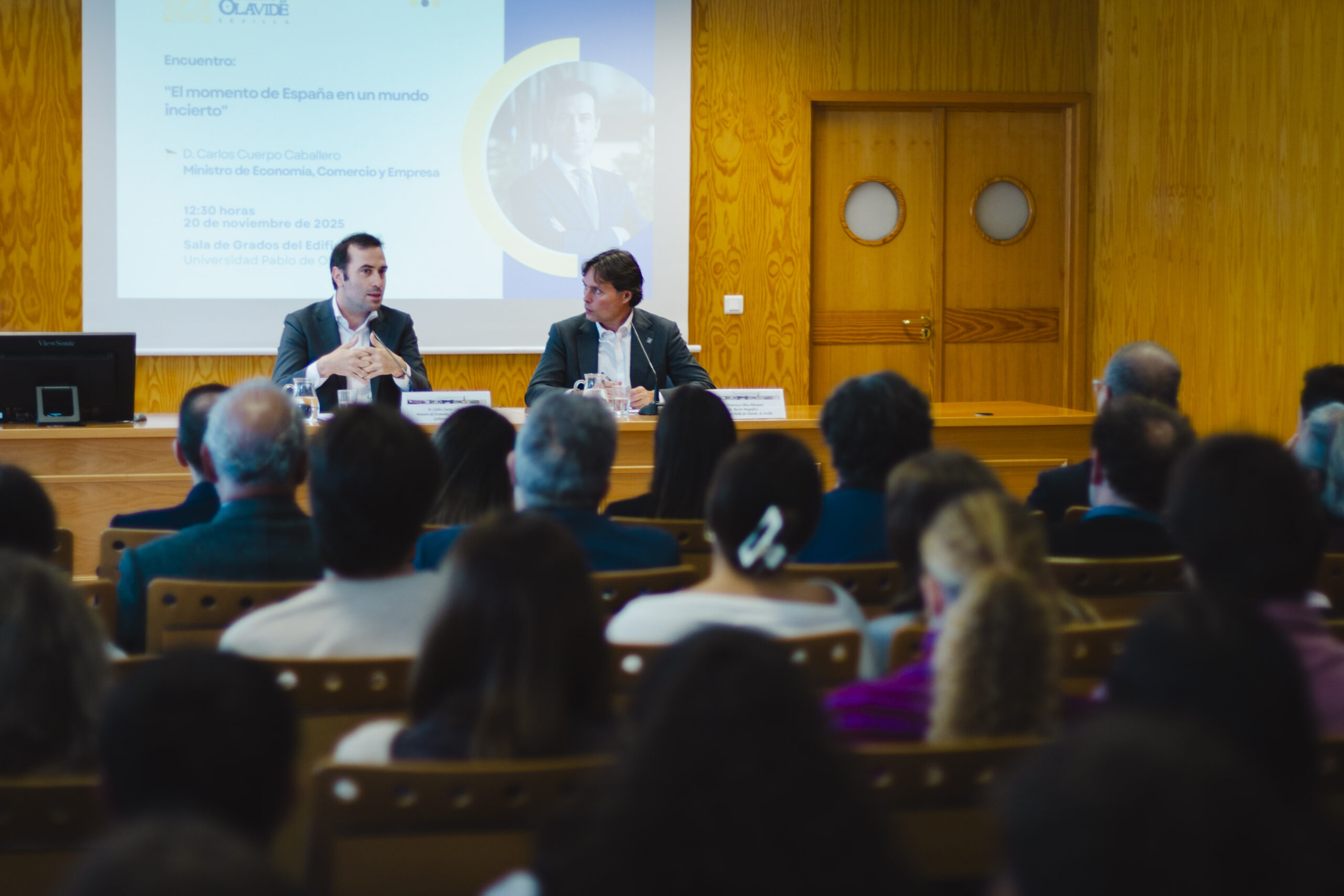 El ministro de Economía, Comercio y Empresa, Carlos Cuerpo Caballero, ha mantenido esta mañana en el campus un encuentro con estudiantes de la Facultad de Ciencias Empresariales de la Universidad Pablo de Olavide, en un acto presidido por el rector Francisco Oliva y que ha llevado por título ‘El momento de España en un mundo incierto.