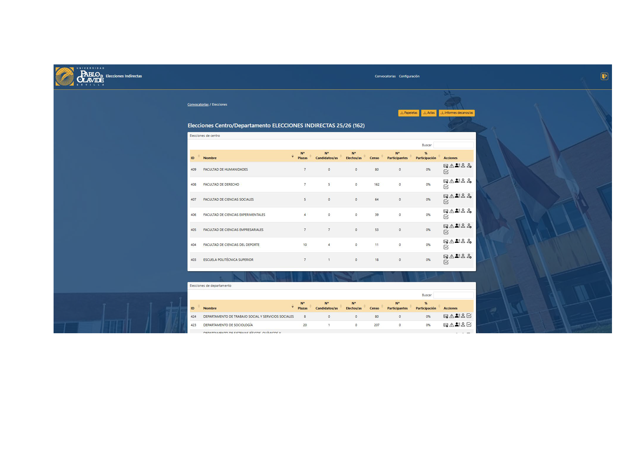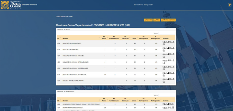 La Universidad Pablo de Olavide ha culminado con éxito las elecciones indirectas de representantes estudiantiles en Juntas de Centro y Consejos de Departamento, celebradas el pasado jueves, 27 de noviembre, estrenando por primera vez un sistema automatizado que ha supuesto un salto cualitativo en la gestión electoral de la UPO.