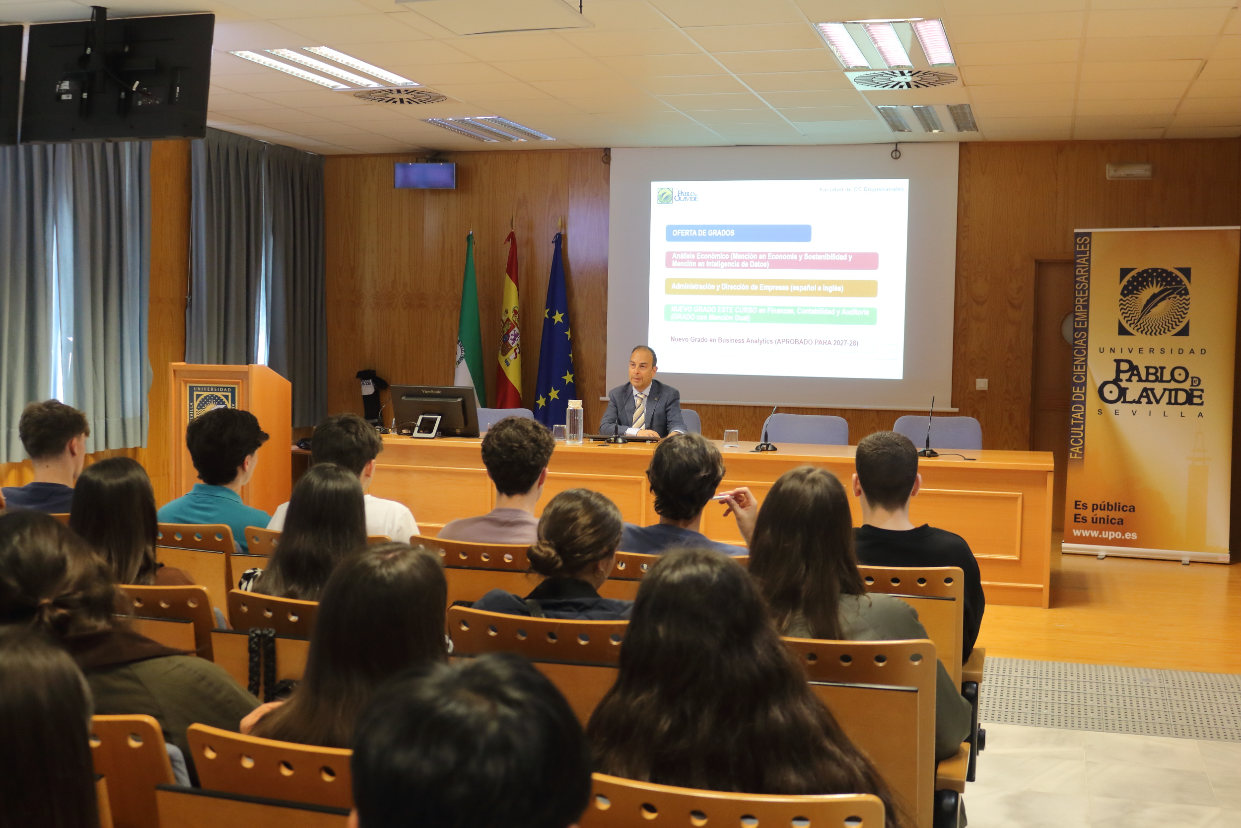El decano de la Facultad de Ciencias Empresariales de la UPO, Álvaro López Cabrales, ha dado la bienvenida a los estudiantes de los centros de Secundaria y Bachillerato y ha detallado las particularidades de la oferta académica de los estudios de Grado de la Facultad: Grado en Análisis Económico y sus nuevas menciones de especialización en Economía y Sostenibilidad y en Inteligencia de Datos; Grado en Finanzas, Contabilidad y Auditoría con la opción de Mención Dual; Grado en Administración y Dirección de Empresas (español e inglés) y los Dobles Grados con la Facultad de Derecho.