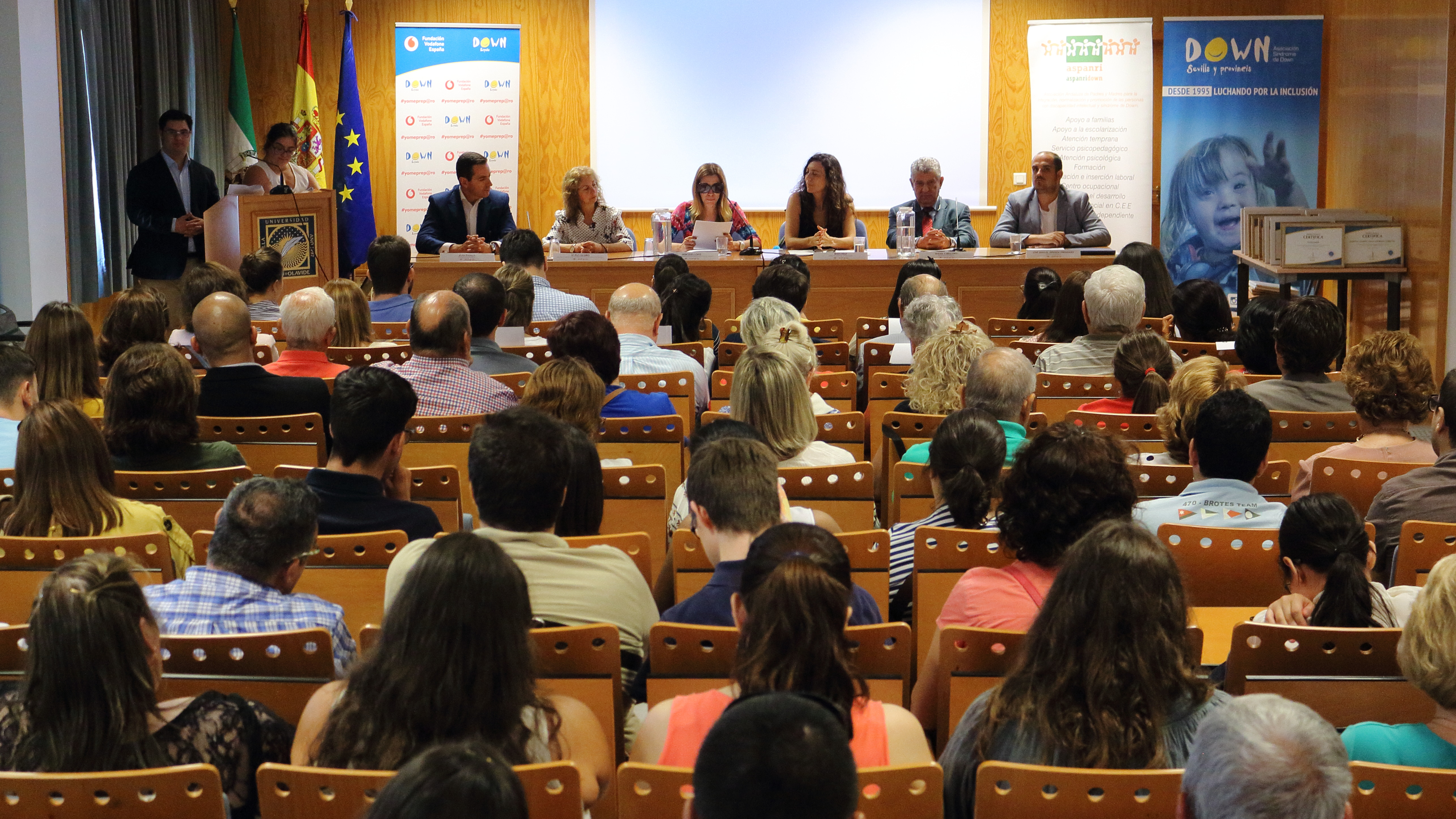 La decana de la Facultad de Ciencias Sociales de la Universidad Pablo de Olavide, Rosa María Díaz Jiménez, ha dado la bienvenida al acto celebrado hoy, que a continuación ha sido presentado por Pablo Velázquez y Teresa Caballero, usuarios de ASPANRIDOWN y DOWN Sevilla.