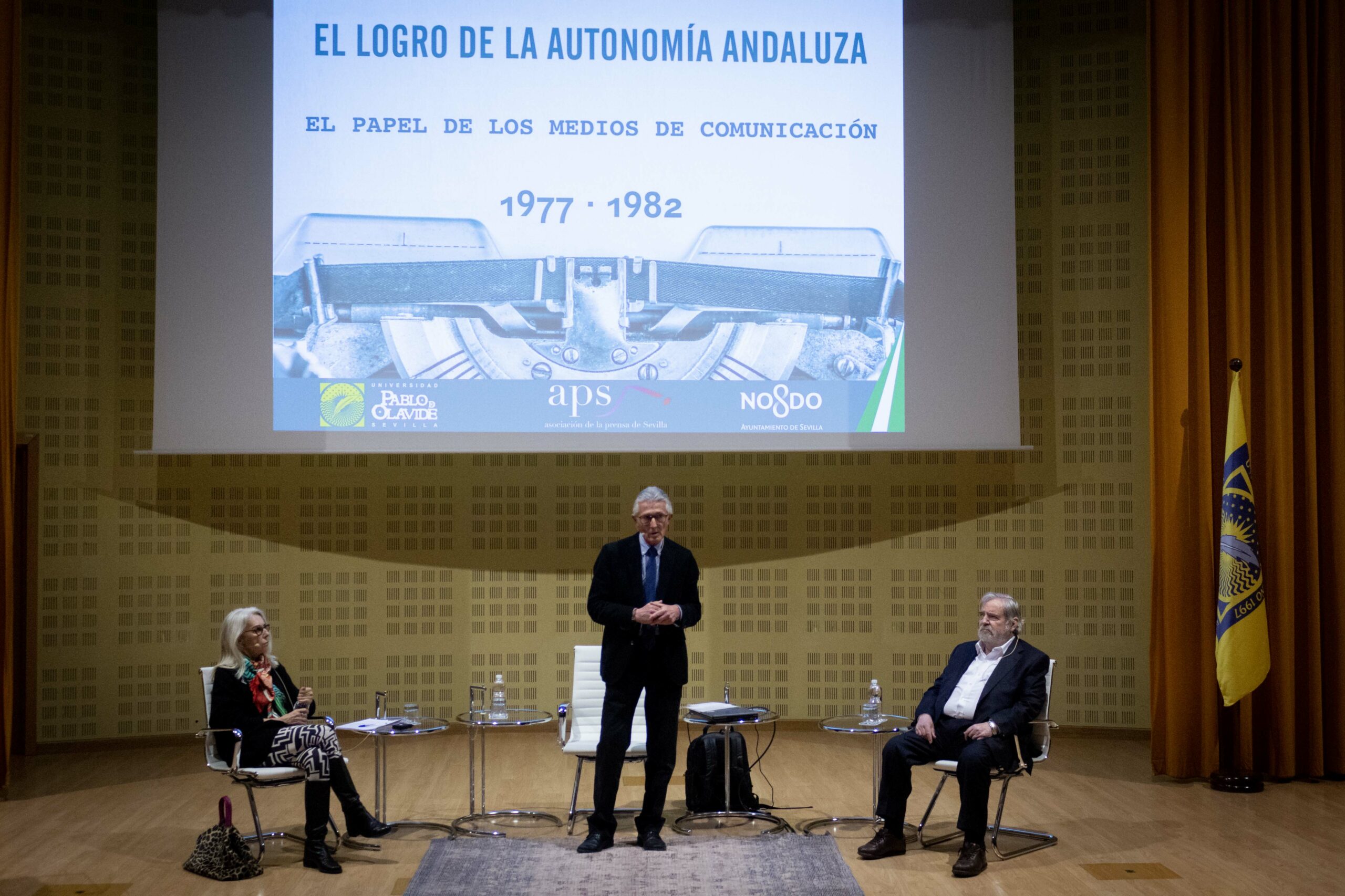 El programa de debates contempla cuatro mesas redondas con la participación de protagonistas de aquellos momentos, personas que vivieron en primera persona ‘el logro de la autonomía andaluza’. La primera ha tenido lugar esta tarde en el Paraninfo de la UPO con el título ‘El papel de los medios de comunicación’. Han asistido a este primer debate, Lola Cintado, jefa de prensa de Plácido Fernández Viagas, primer presidente de la preautonomía andaluza y periodista de la agencia EFE; Enrique García, director de comunicación de Rafael Escuredo, segundo presidente preautonómico y primer presidente de la Junta de Andalucía y periodista de la Cadena SER; y Rafael Rodríguez, presidente de la Asociación de Prensa de Sevilla.