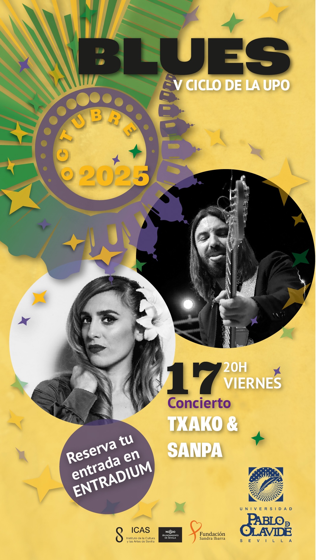 Viernes ,17 de octubre, 20 horas: Txako & SanpaGuitarra y voz unen sinergias para darle vida a este proyecto en el cual rinden pleitesía a los nombres más relevantes de la historia del blues y del soul. Txako, considerada una de las voces más versátiles de la escena sevillana, y Pablo Sanpa, consolidado guitarrista con amplía carrera a nivel nacional e internacional. El innegable eclecticismo de ambos artistas es lo que ha resultado en un repertorio de canciones que van desde el blues más primigenio hasta la elegancia del estilo West Coast, incluyendo pasajes de la energía del blues de Chicago, el Rhythm and blues o el Soul.