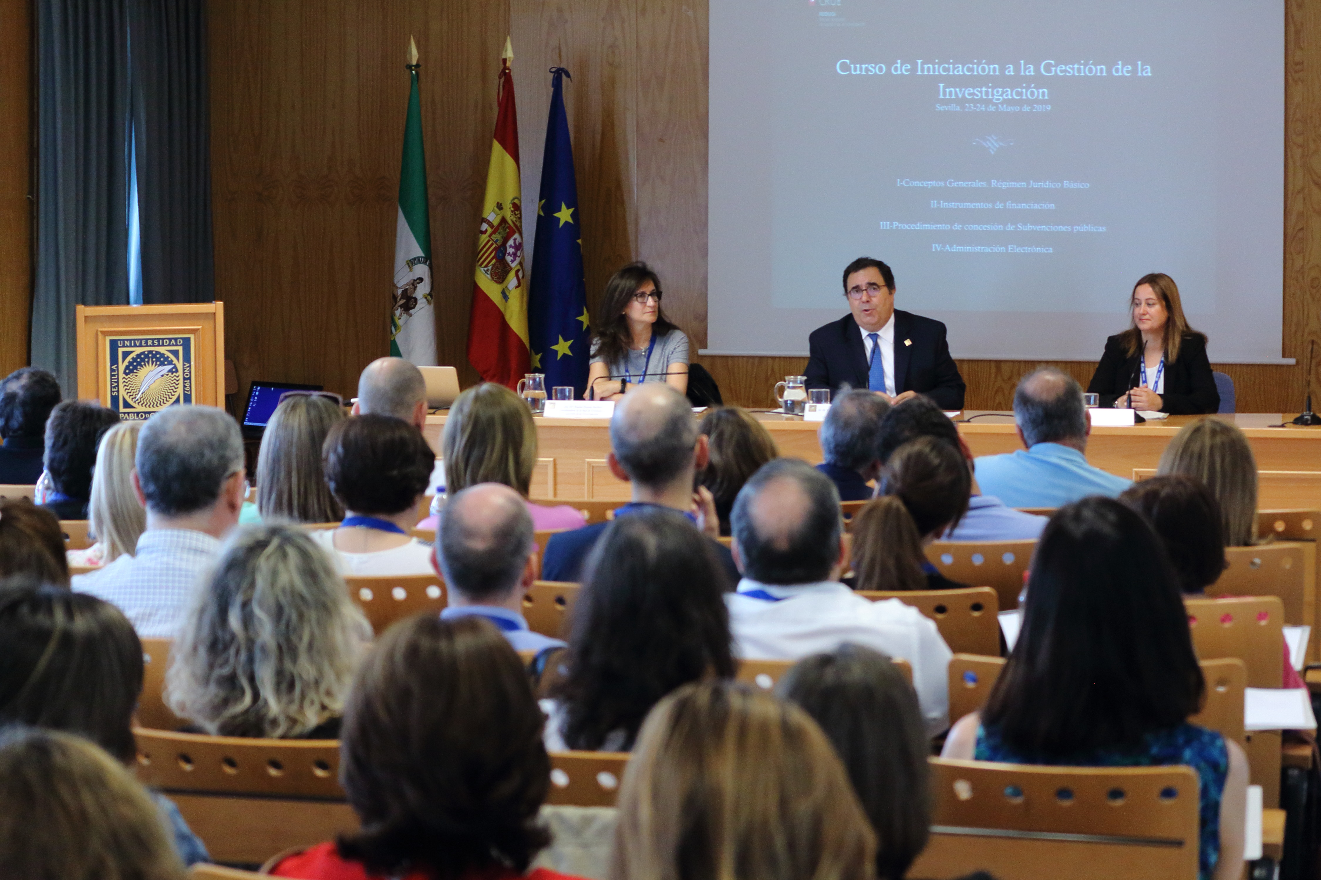 El rector Vicente Guzmán Fluja ha inaugurado hoy el ‘Curso de iniciación a la gestión de la investigación’, un encuentro organizado por la UPO con la colaboración de la Red de Unidades de Gestión de Investigación (Red UGI). El rector ha estado acompañado por Esperanza Pérez Mañas, directora del Área de Investigación de la UPO y vocal de la Red UGI, y por Anabel Poveda Barbero, directora del Servicio de Investigación de la Universidad Autónoma de Barcelona y coordinadora de dicha red.