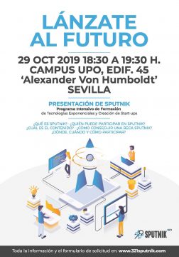 Promovido desde el Vicerrectorado de Estrategia, Empleabilidad y Emprendimiento, hoy se presenta en el edificio Alexander von Humboldt de la UPO, en primicia, el programa Sputnik. Se trata de una iniciativa innovadora dirigida a cambiar la mentalidad de jóvenes emprendedores sensibilizándolos respecto a las tecnologías exponenciales y la creación de startups.
