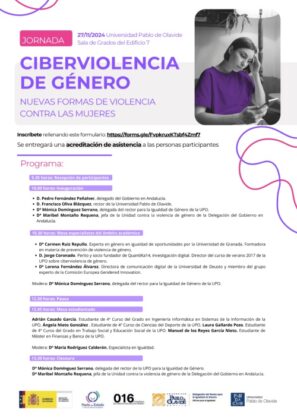 El rector de la Universidad Pablo de Olavide, Francisco Oliva Blázquez, y el delegado del Gobierno en Andalucía, Pedro Fernández Peñalver, han inaugurado esta mañana la Jornada ‘Ciberviolencia de Género. Nuevas formas de violencia contra las mujeres’ con motivo de la conmemoración del Día Internacional para la Erradicación de las Violencias contras las Mujeres el 25 de noviembre.