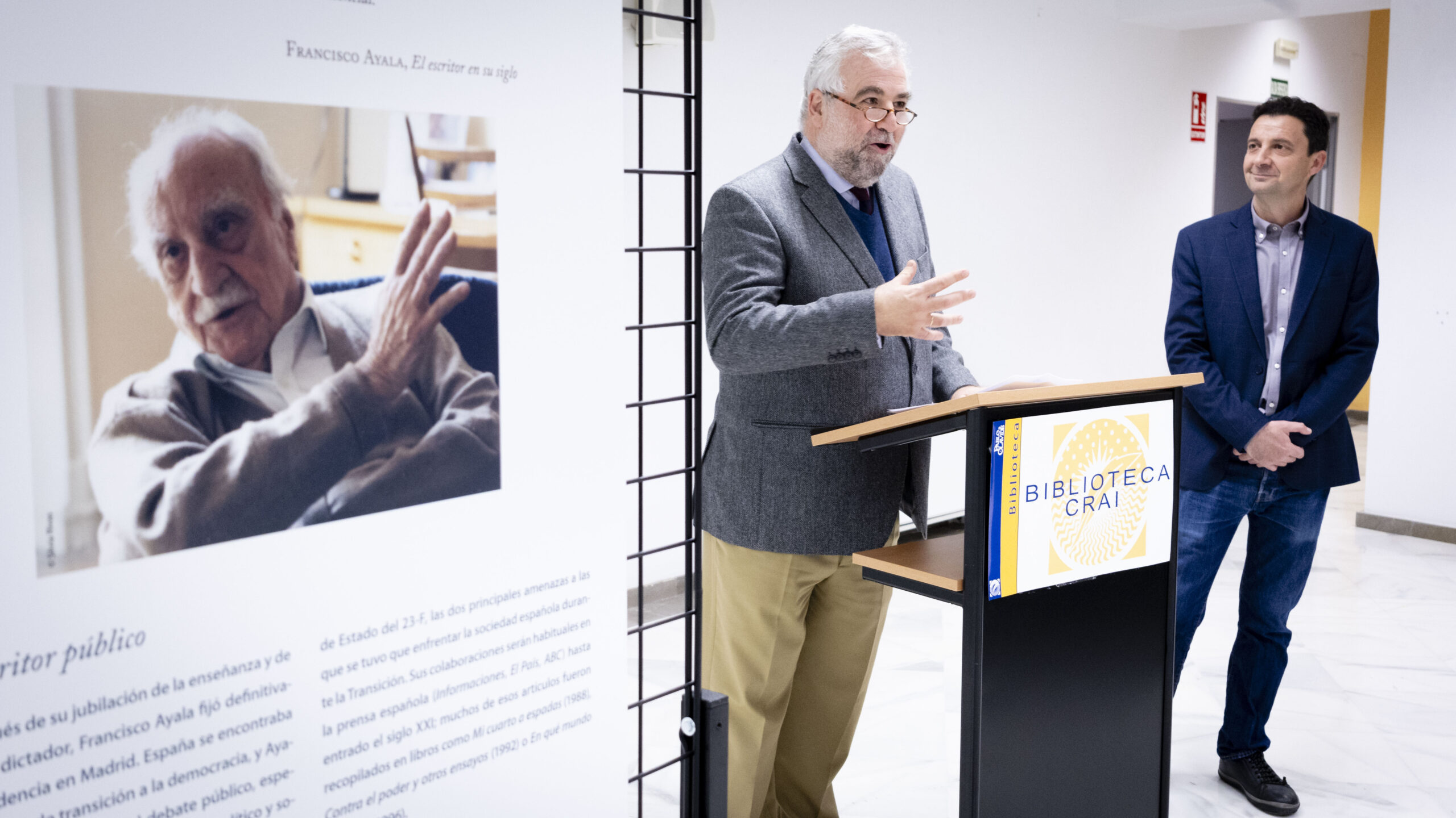 ‘Francisco Ayala y las Ciencias Sociales’ recorre a través de doce paneles la obra del autor granadino en el ámbito de la Sociología y de las Ciencias Políticas. Manuel Gómez Ros, director de la Fundación Francisco Ayala, y César Hornero Méndez, decano de la Facultad de Derecho de la Olavide, han inaugurado esta mañana la exposición, que podrá visitarse en la Biblioteca/CRAI hasta el 7 de marzo.