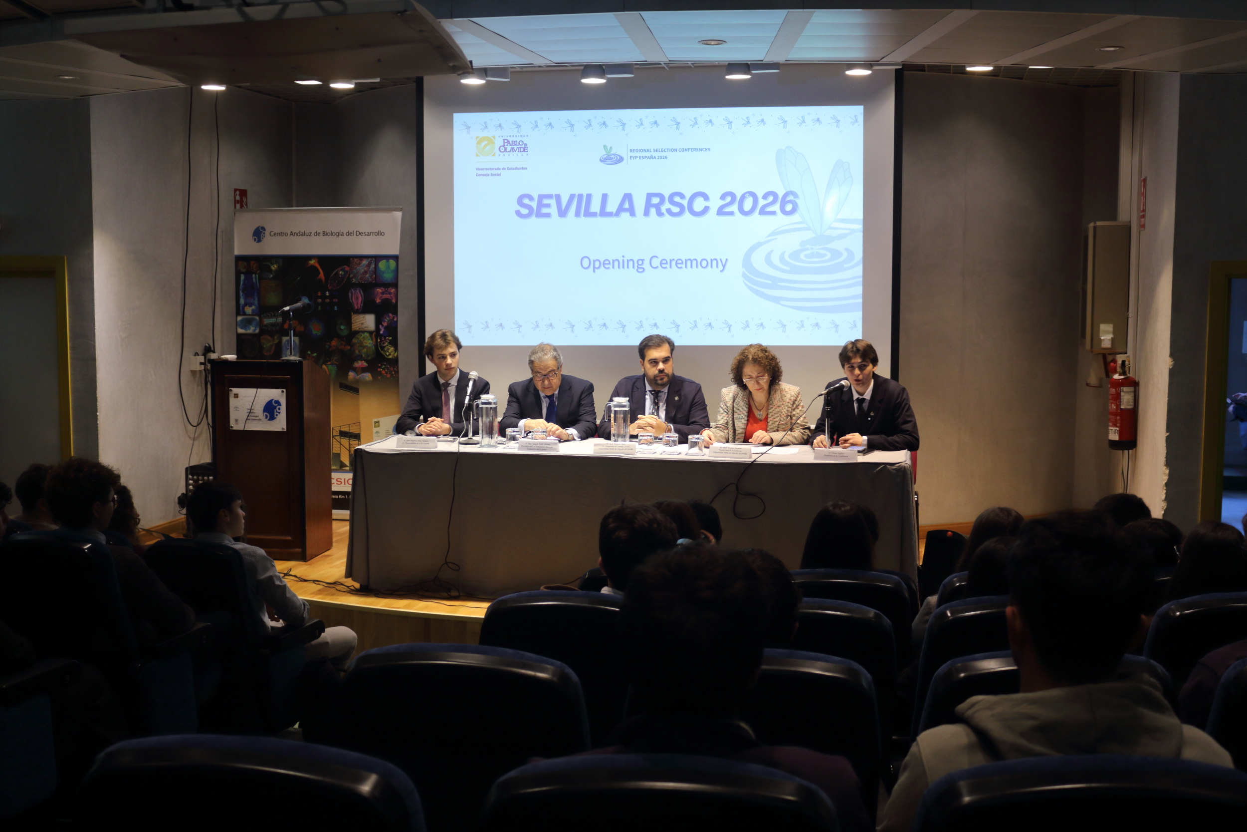 El European Youth Parliament se ha inaugurado esta mañana, en el Salón de Grados del Centro Andaluz de Biología del Desarrollo de la Universidad Pablo de Olavide. El acto ha contado con las intervenciones de la presidenta de la Conferencia de EYP, Fiona Hafferl; del vicepresidente de EYP España, Joan Baptista Blasi Romero; el diputado al Parlamento Europeo y exministro del Interior de España, Juan Ignacio Zoido Álvarez; la vicerrectora de Estudiantes de la Universidad Pablo de Olavide, Pilar Moreno Navarro; y el presidente del Consejo Social de la UPO, Iván Pestaña Ruiz.