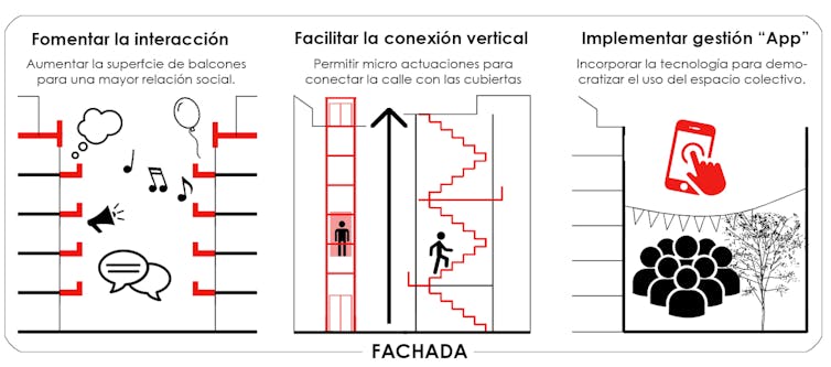 • Generar nuevas conexiones verticales en fachada, medianeras e interiores de edificios para mejorar la accesibilidad a las cubiertas y también como espacios alternativos a la vivienda (P).
