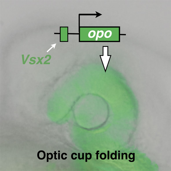 Gráfico que ilustra esquemáticamente el papel que la proteína Vsx2 tiene en la coordinación del programa genético de formación del ojo. La actividad de la proteína Vsx2 es esencial tanto para definir la identidad molecular de la retina neural (verde en el esquema) como su plegamiento tridimensional. Este segundo proceso, que implica la constricción basal de las células del tejido, tiene lugar a través de la activación directa del gén que codifica para la proteina Opo, un regulador de la adhesión en la retina en desarrollo.