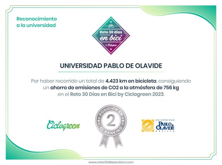 La Universidad Pablo de Olavide ha conseguido la segunda posición en el ‘Reto 30 días en Bici’ by Ciclogreen 2023 por su contribución a la reducción de la huella de carbono y al fomento de la vida saludable gracias al compromiso demostrado por la comunidad universitaria al lograr 4.423 kilómetros recorridos en bicicleta, lo que supone un ahorro de emisiones de CO2 a la atmósfera de 756 kilos. El primer puesto ha sido para la Universidad de Castilla-La Mancha con 7.834 kilómetros.