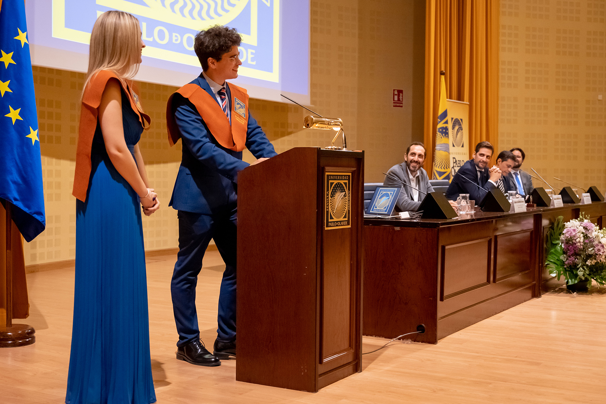 En representación del alumnado egresado, pronunciaron los discursos Sandra Gamero Ortega y Diego Delgado Cháves. Un total de 26 egresados y egresadas asistieron, junto a sus familiares, a este acto con el que la Universidad Pablo de Olavide recupera una antigua tradición de las universidades europeas.
